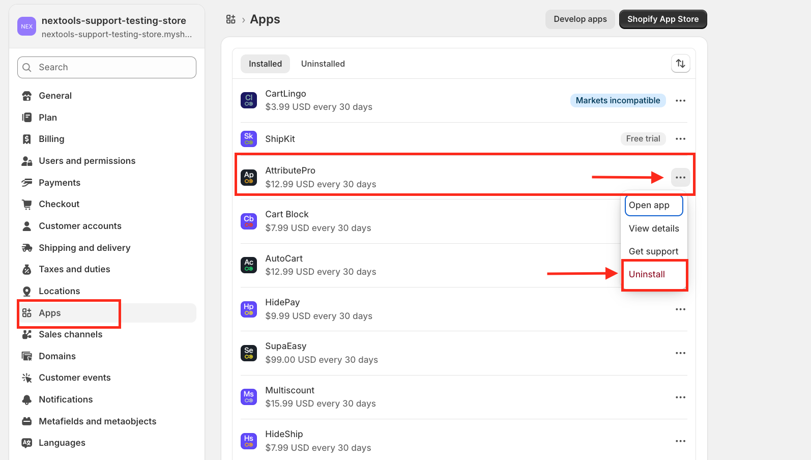 This tutorial will guide you step-by-step through the process of uninstalling the AttributePro application from your Shopify store and deleting your subscription.