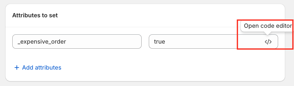 AttributePro also provides a code editor option. Simply hover over the code icon and click it to open the editor. This is useful if you want to write a longer or more complex attribute value.