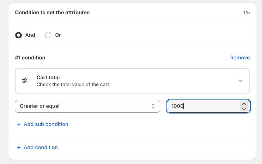 Under Conditions to set the attributes, configure the following: Select Cart total, Choose Greater than and Enter 1000