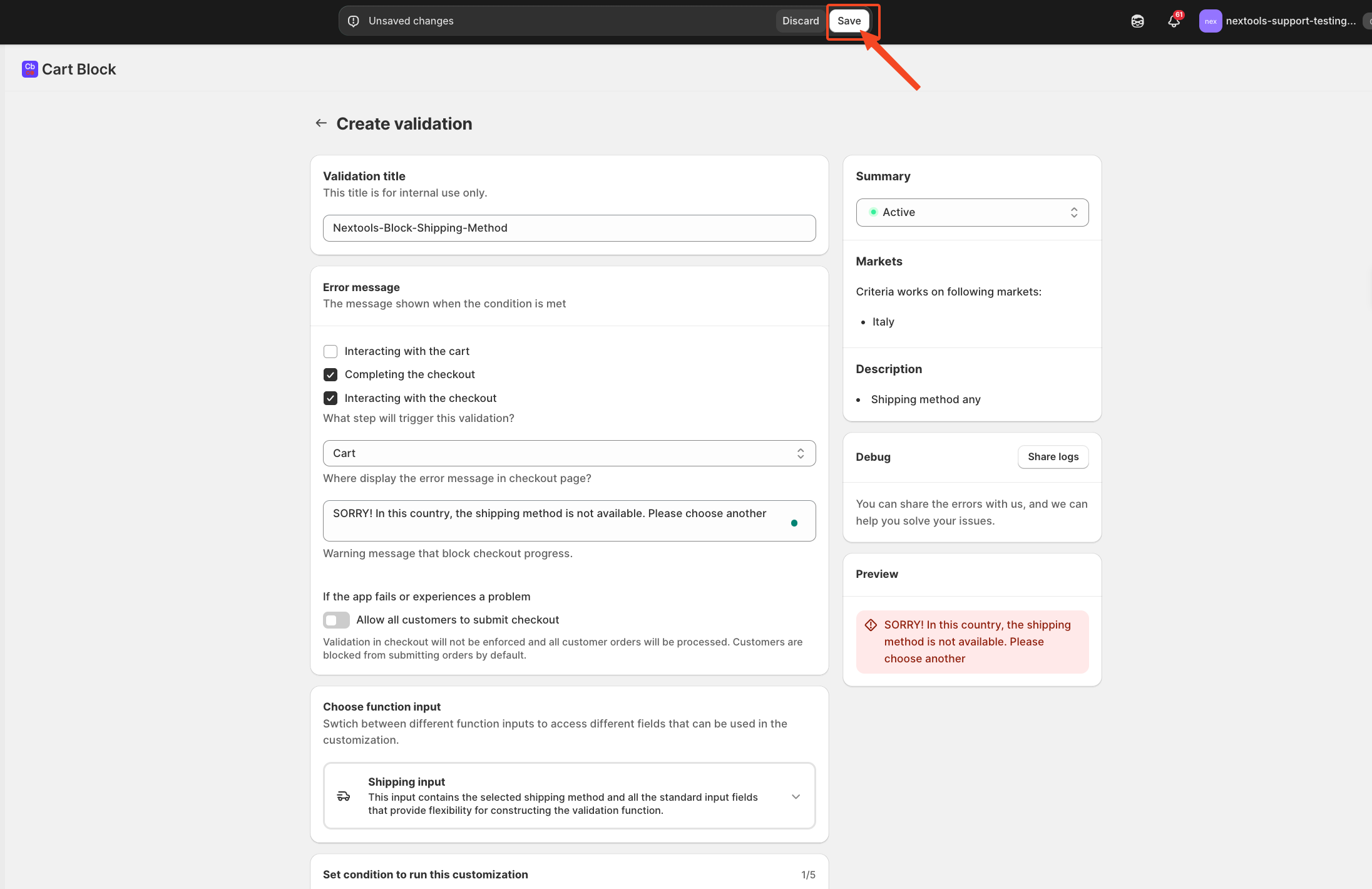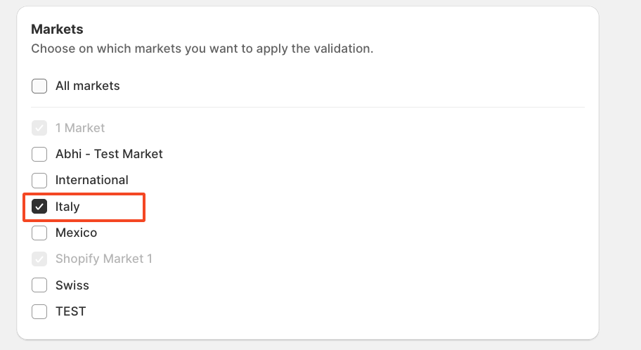 Next, specify the market where this validation should be applied. In this case, we are restricting any shipping option for customers in Italy.