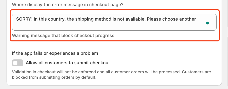 The configured error message will be displayed on the checkout page whenever a customer selects the blocked shipping method.