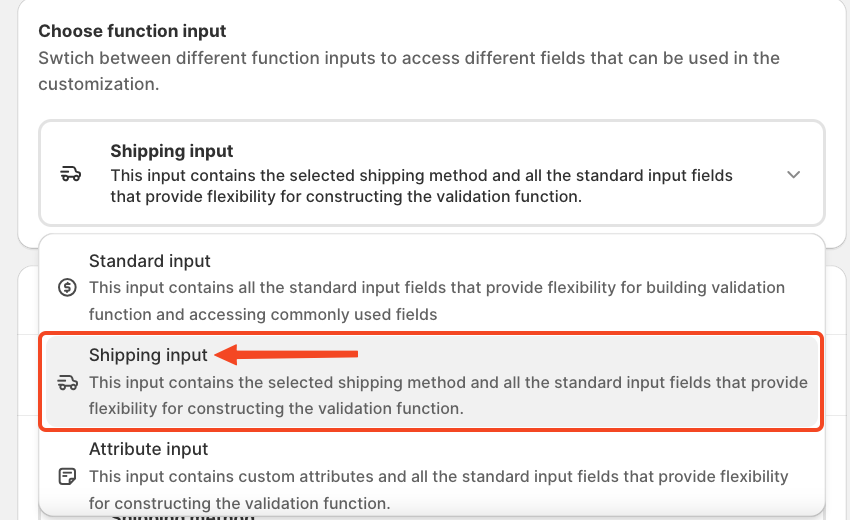 In this step, you need to choose the function input, which allows access to different fields for customisation. Since we are hiding a specific shipping method, we will select the Shipping Input option.