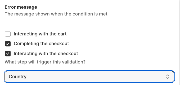 Next, determine where the validation should be applied. CartBlock offers three scopes: interactions with the cart, checkout completion and interaction within the checkout process. You can enable one, two or all three, depending on your requirements.
