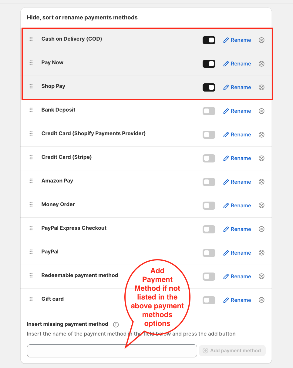 Toggle the switch ON for the payment methods you want to hide.