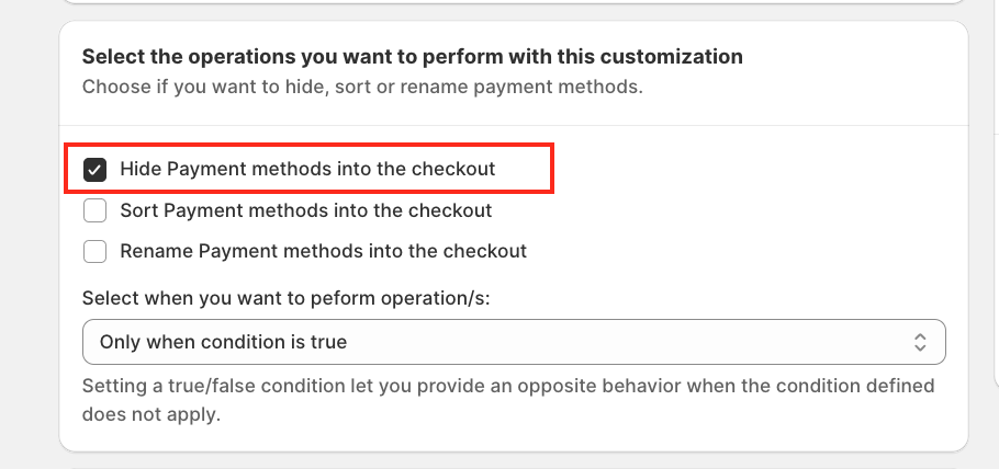 Since the goal of this tutorial is to hide payment methods, select: