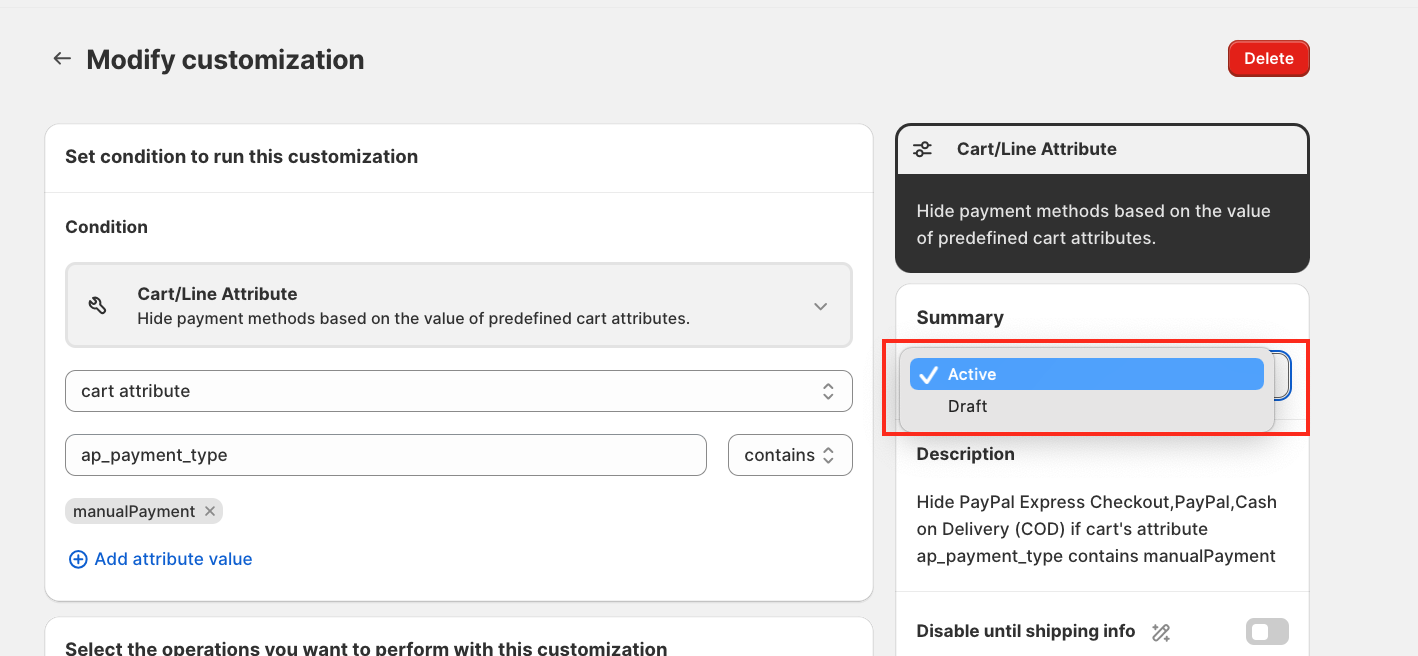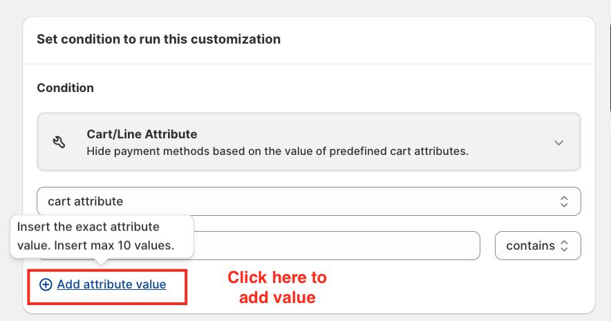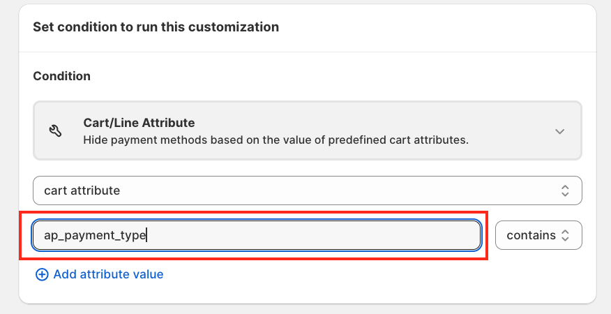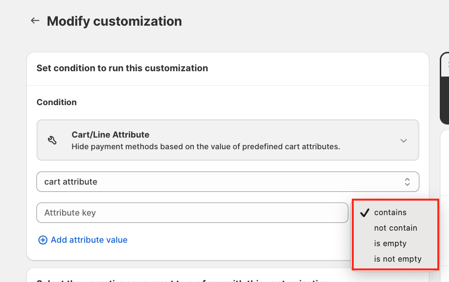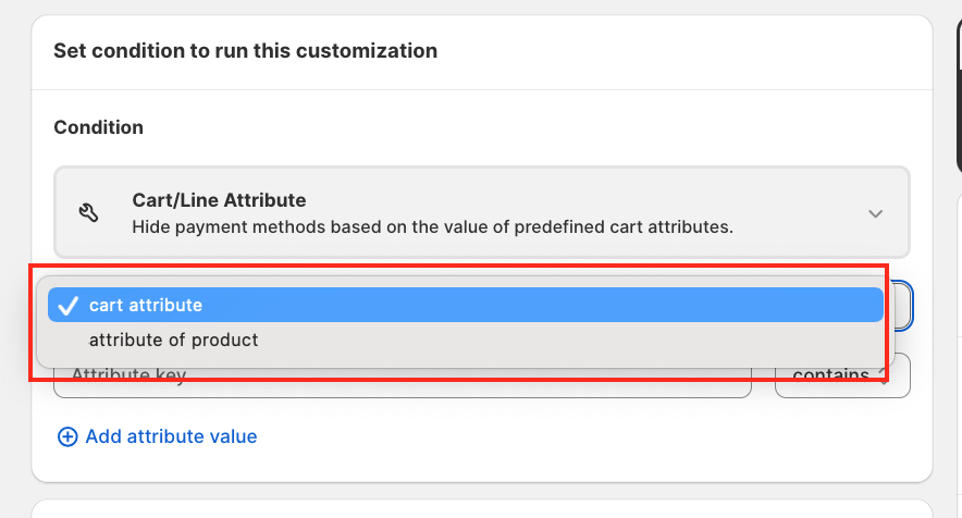 Click on the Condition section. Scroll down and select Cart/Line Attribute (this is a new feature in HidePay). When selected, you will see two options: Cart Attribute/Line Attribute