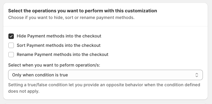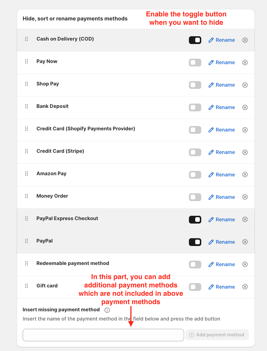 Choose what you want to do with the payment methods: Hide, Sort and Rename