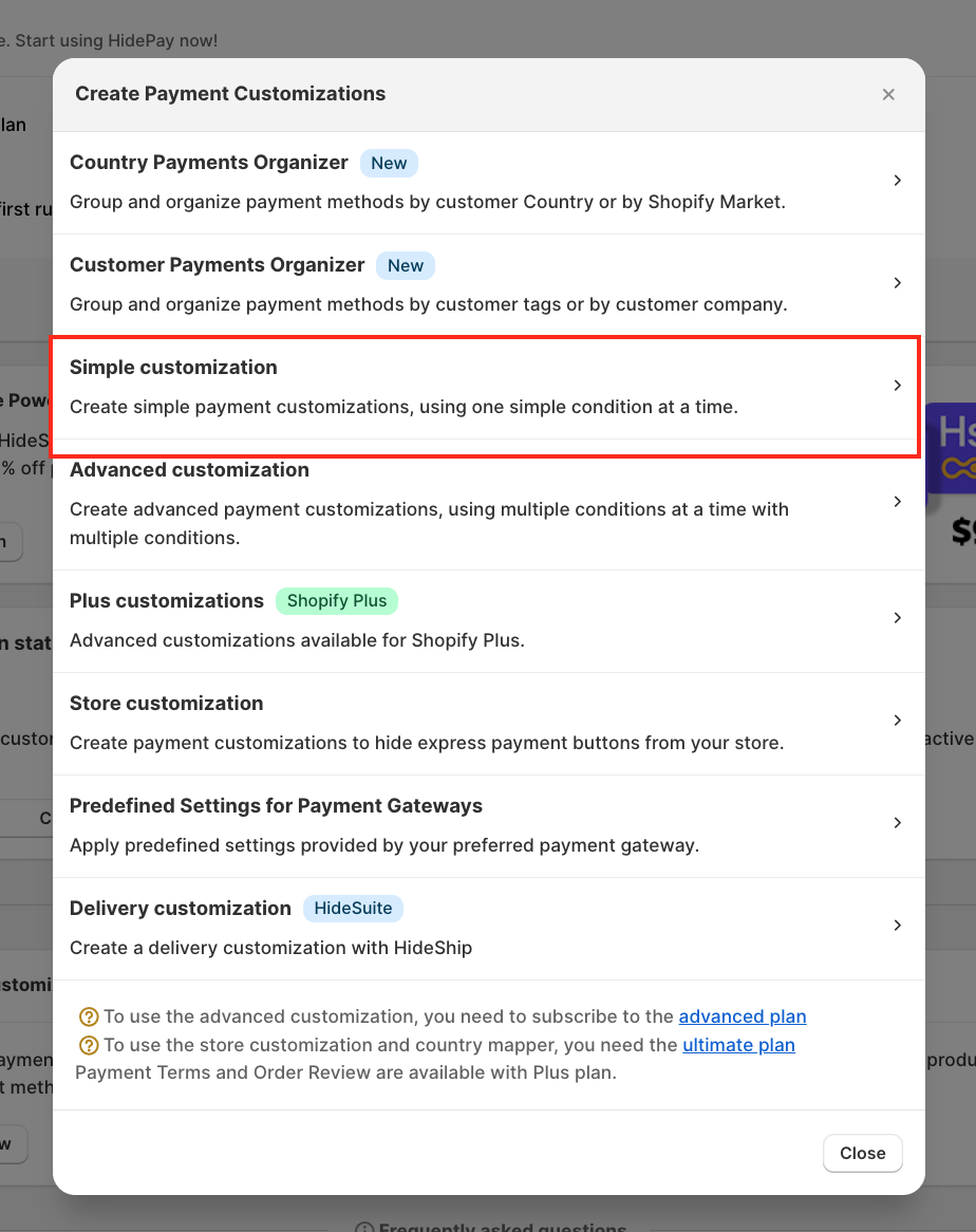 Let’s get started with Simple Customisation. Click on Create under Payment Customisation.