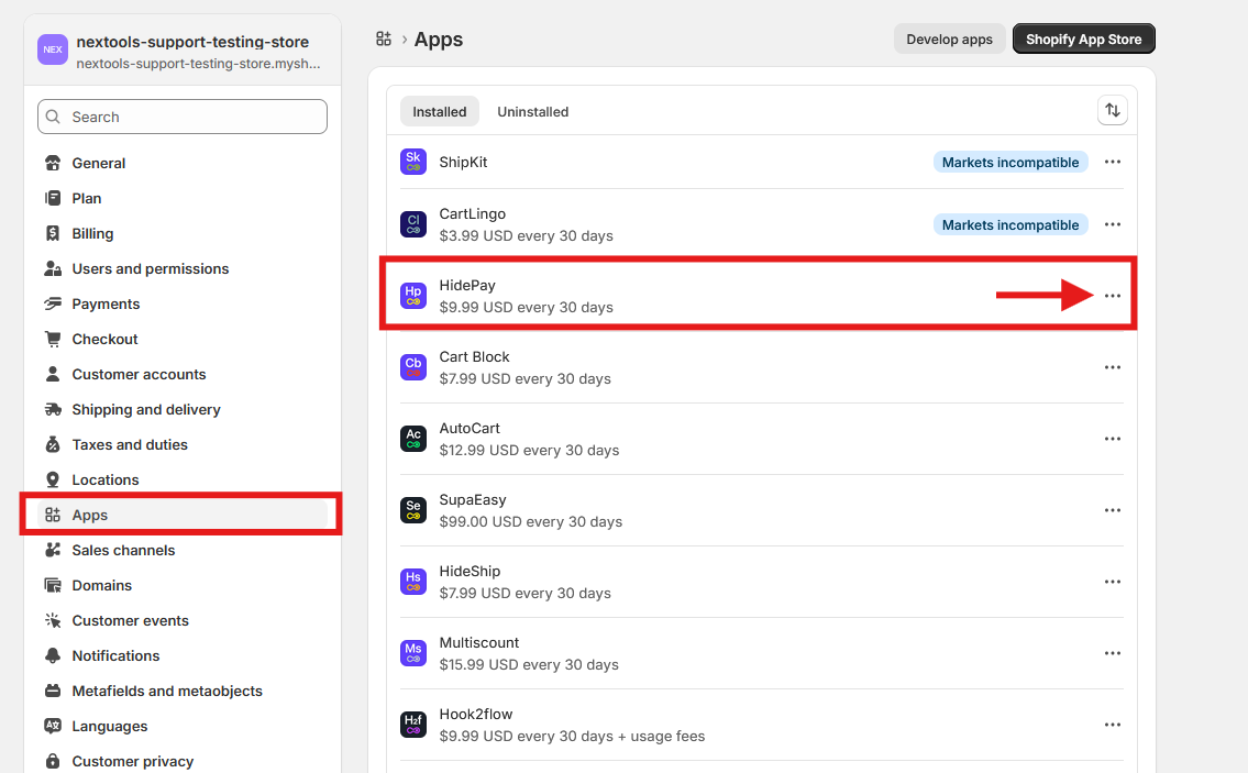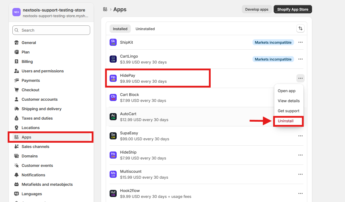 This tutorial will guide you step-by-step through the process of uninstalling the HidePay application from your Shopify store and delete your subscription. Follow the instructions below.