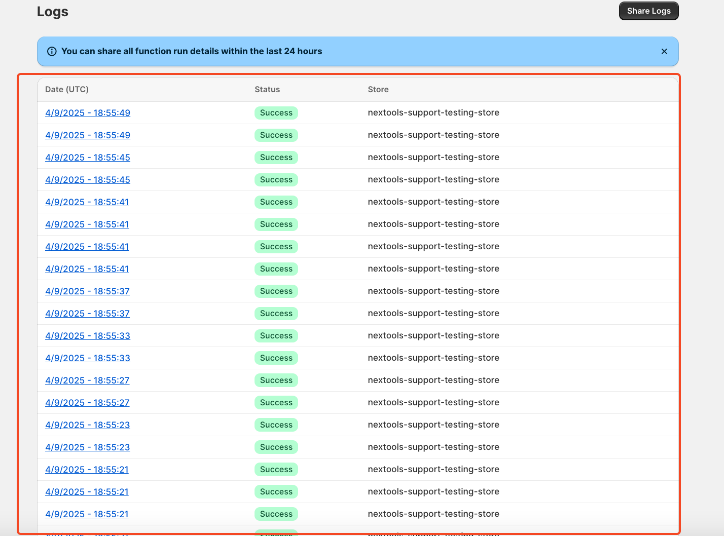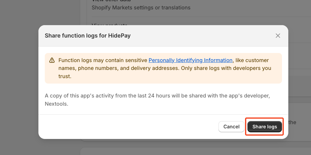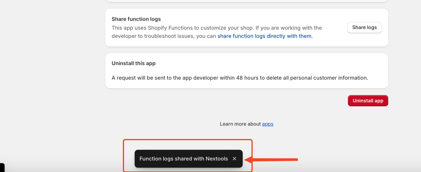 On the final click, you will see a confirmation message: "Function logs shared with Nextools."