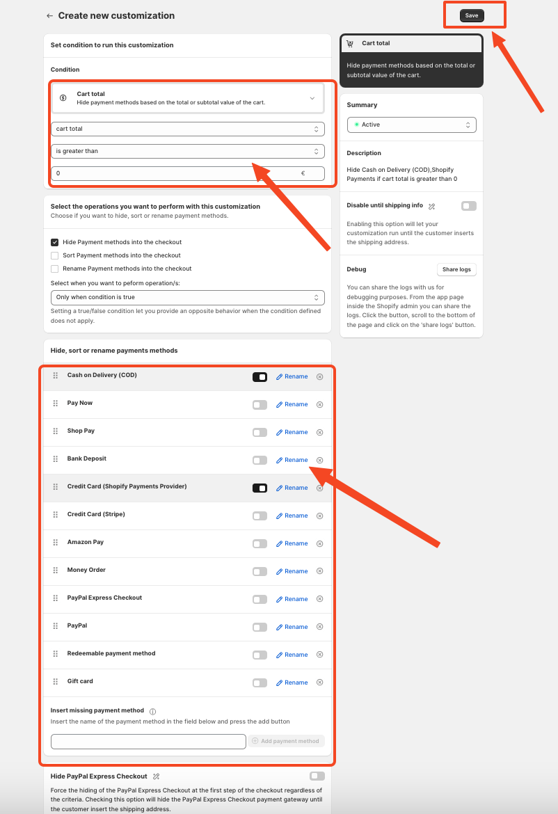 Once done, save the rule again. Now check your live or development store—your selected payment method should be successfully hidden.