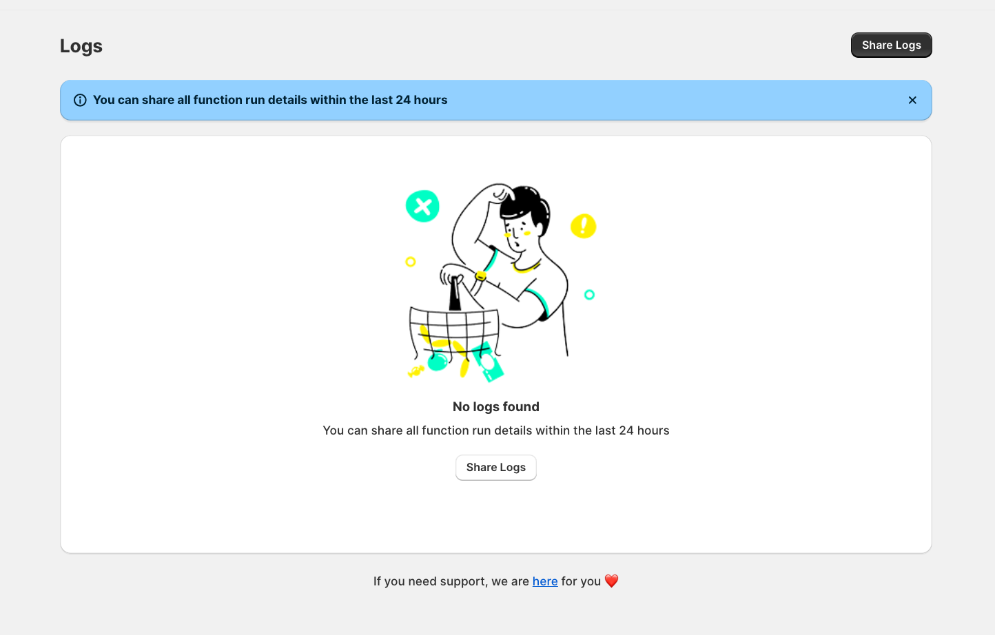 After clicking on Logs, you might see that the logs are empty, as shown in the image below. Next, click on the "Share Logs" button located at the top-right corner of the page.