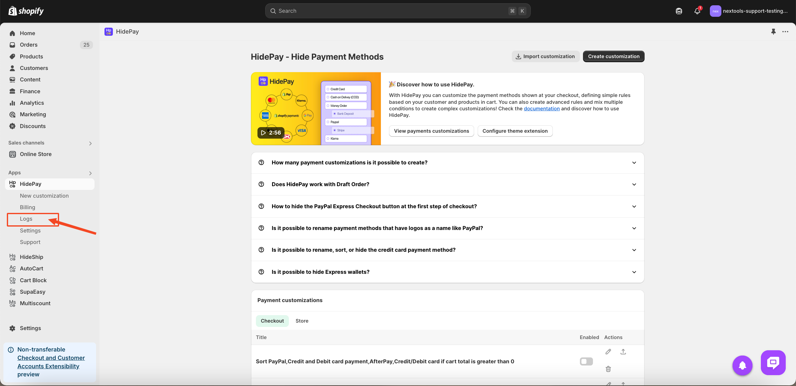 If the payment methods are not being hidden according to the rule, go back to the HidePay application dashboard and click on the Logs option.