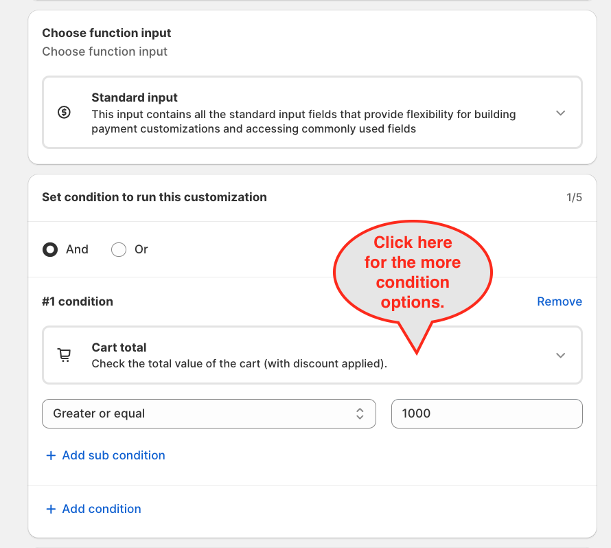 You can configure different conditions based on your requirements. You may add up to 5 conditions within a single customisation rule for greater flexibility.