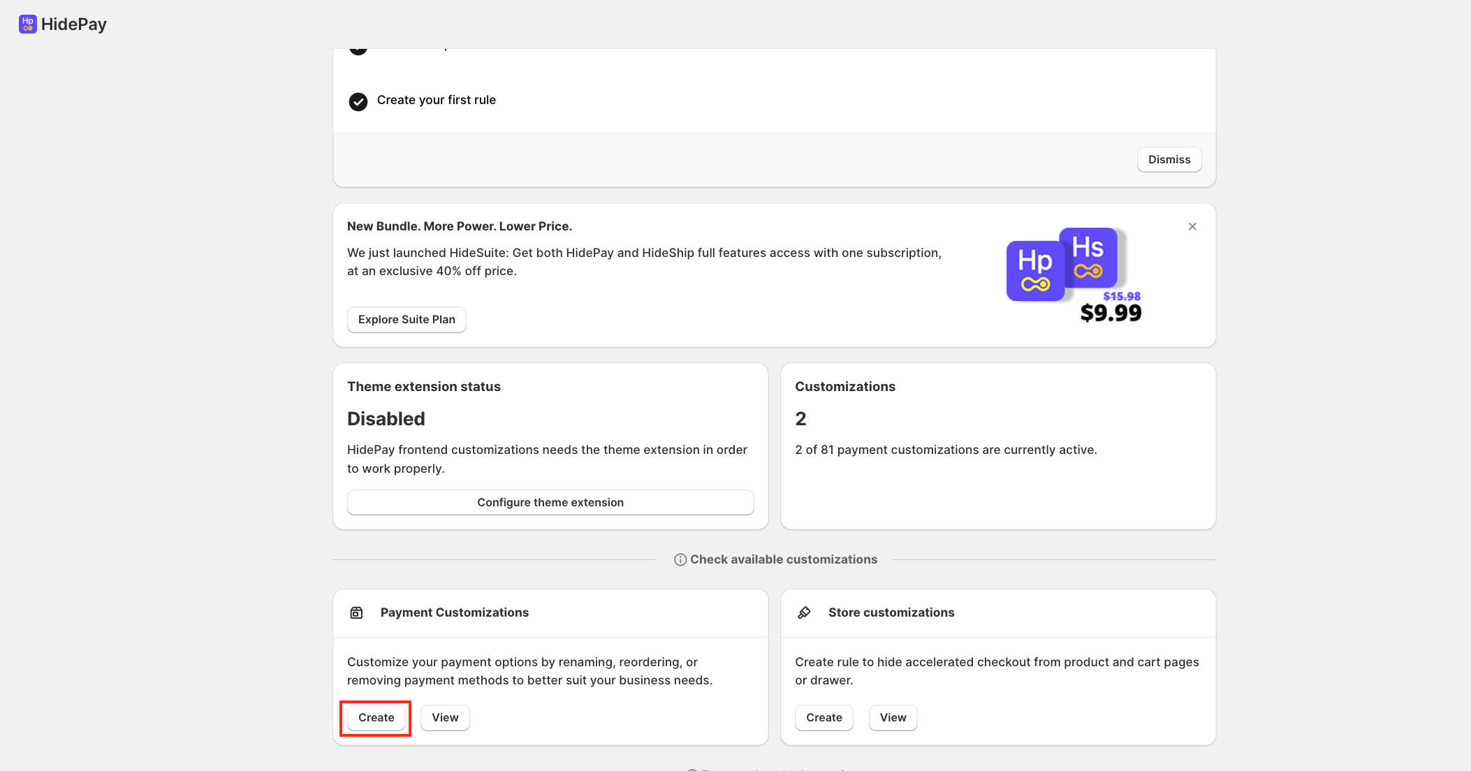 ➡️ Click on the Create button under the Payment Customisation section.