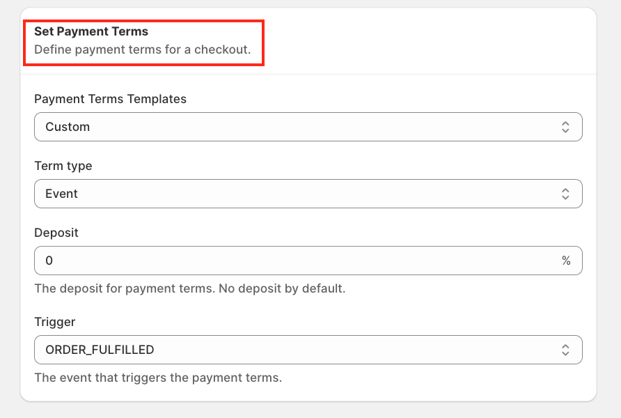 Configure flexible payment terms, including pay-later options, deposits, and event-based payments, by defining conditions such as cart total, customer details, or shipping criteria.