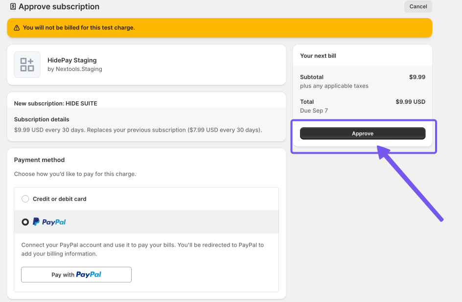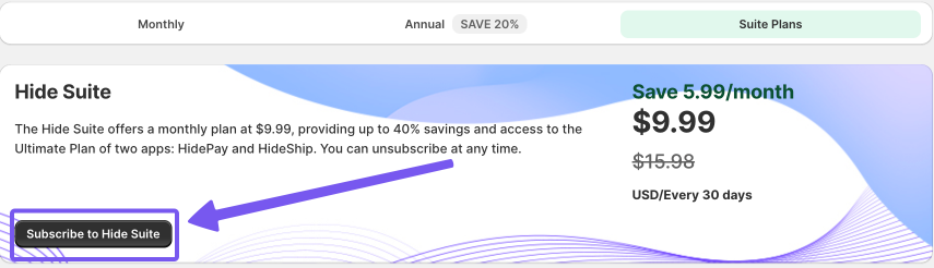 Subscribing to HideSuite is simple and can be done directly from your Shopify admin. Whether you start from HideShip or HidePay, the process is the same: you’ll find the HideSuite Plan option inside the billing section of the app.