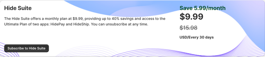 Subscribing to the HideSuite Plan from any of the two apps, will grant you full features access to both HideShip and HidePay at the discounted price of $9.99/month, a 40% saving compared to purchasing separately the highest plans of each app that would cost $15.98/month.