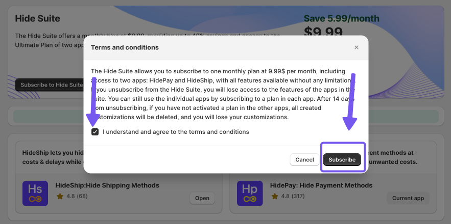 If both apps already have an active subscription, only the app used to activate HideSuite should remain subscribed. For the other app, simply deactivate its existing plan to avoid duplicate billing.
