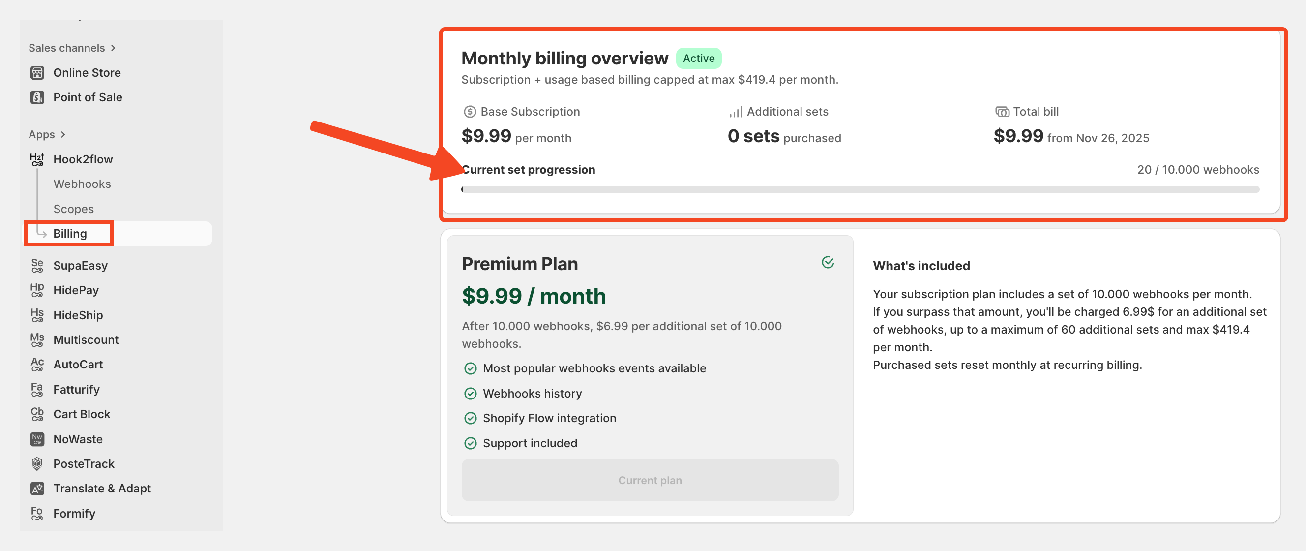 In the Billing page, there is a dynamic progress bar showing all webhooks used and how many webhooks left for your store