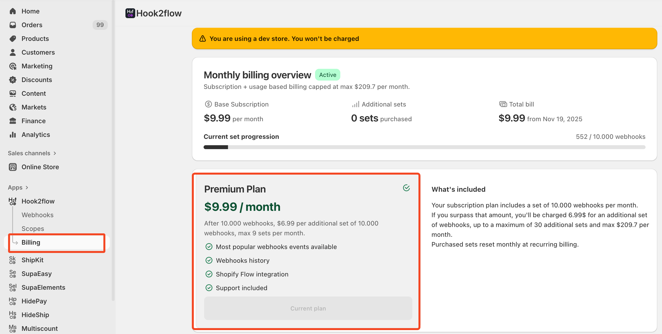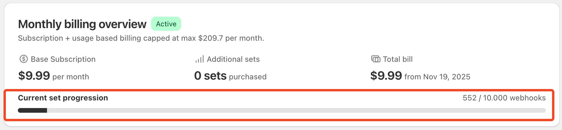 It's important to notice that you can have the full overview on how many webhooks you have left thank to the progress bar in the billing page.