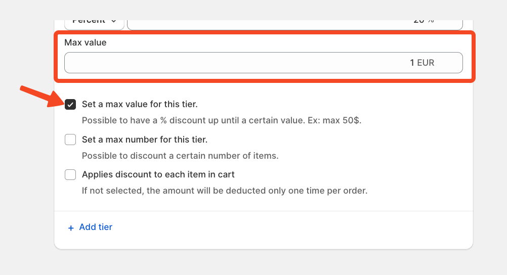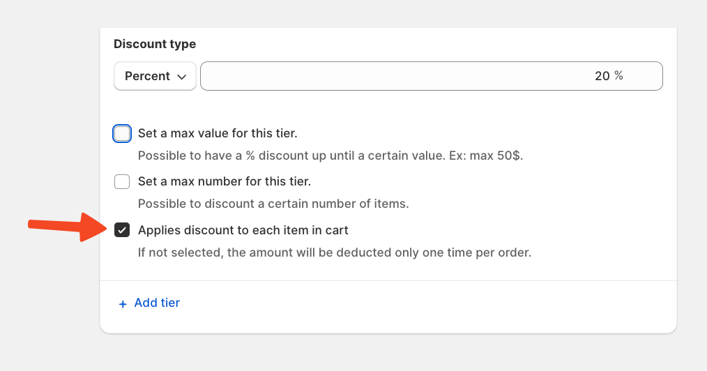 The first checkbox allows you to set the total number of times the discount code can be used across all customers. In this scenario, a single customer can use the code multiple times.