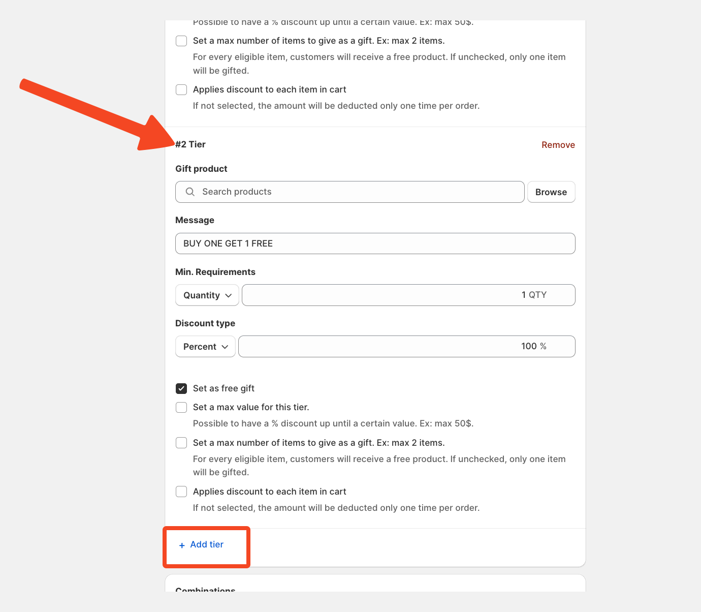 You also have the option to add additional tiers and repeat the configuration to create more complex gift rules.