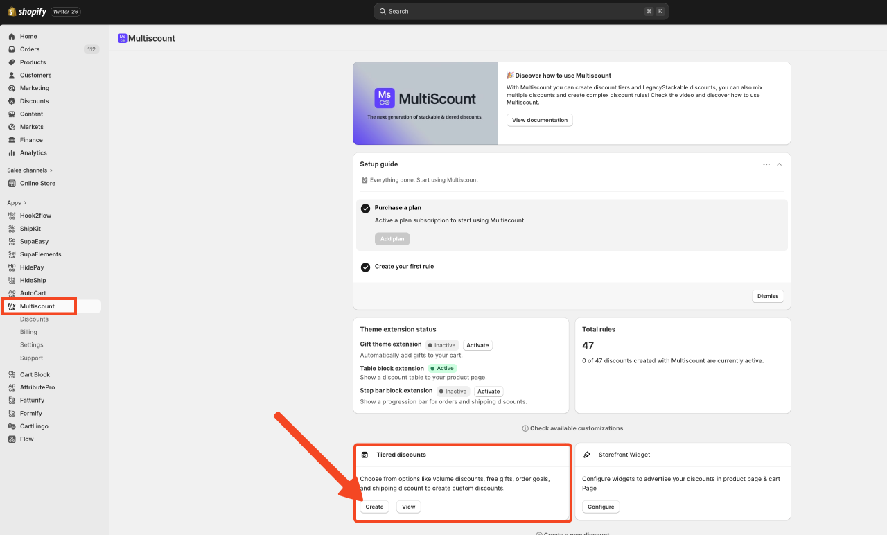 Start by opening Multiscount from your Shopify Admin and clicking on Create Discount.