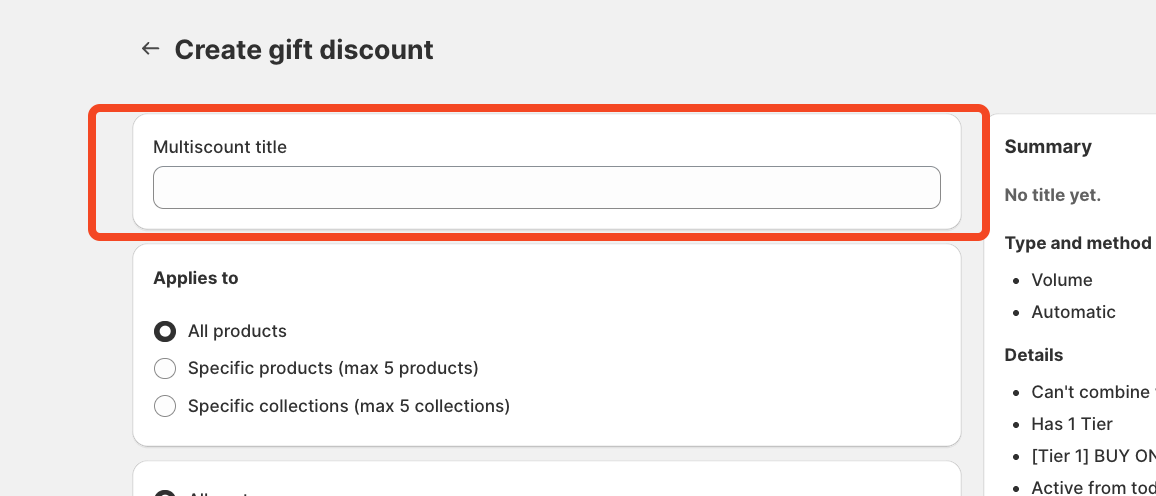 The first required step is setting the discount title, which is mandatory in order to save the discount.