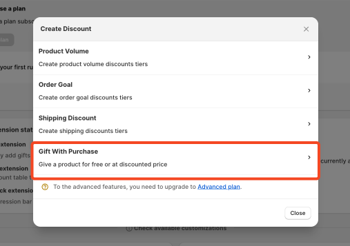 Among the available discount types, select Gift with Purchase. This option is specifically designed to reward customers with a product that is automatically added to the cart when certain conditions are met, either for free or at a discounted price.