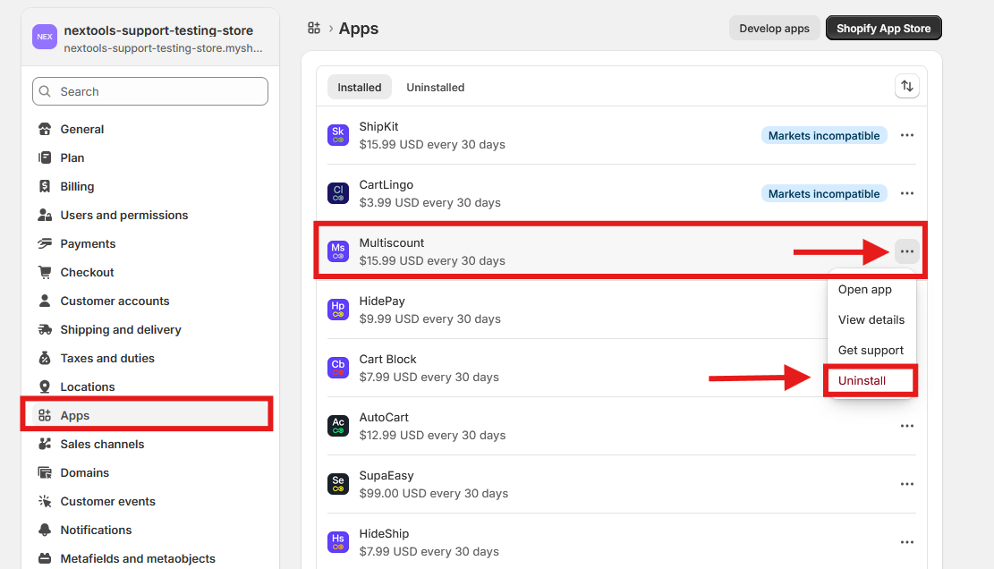 This tutorial will guide you step-by-step through the process of uninstalling the Multiscount application from your Shopify store and delete your subscription. Follow the instructions below.