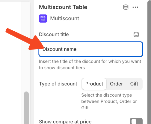 You need to use the same name of the discount to sync the app block to the discout