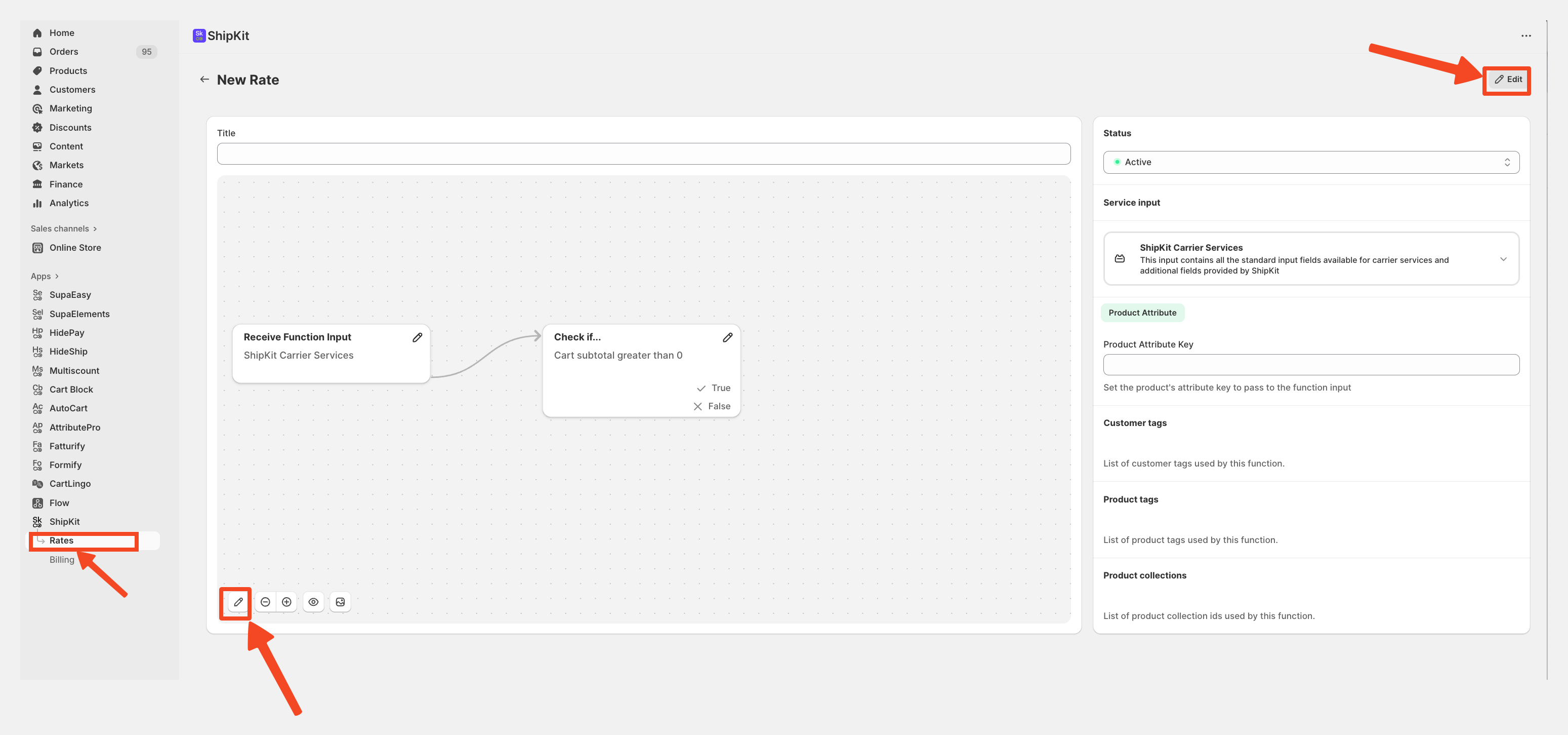 To begin working with node connections, open the rule you want to edit, Go to the Rates section in the ShipKit app, open an existing Dynamic Rate or create a new one and Click Edit to enter the Flow Editor.