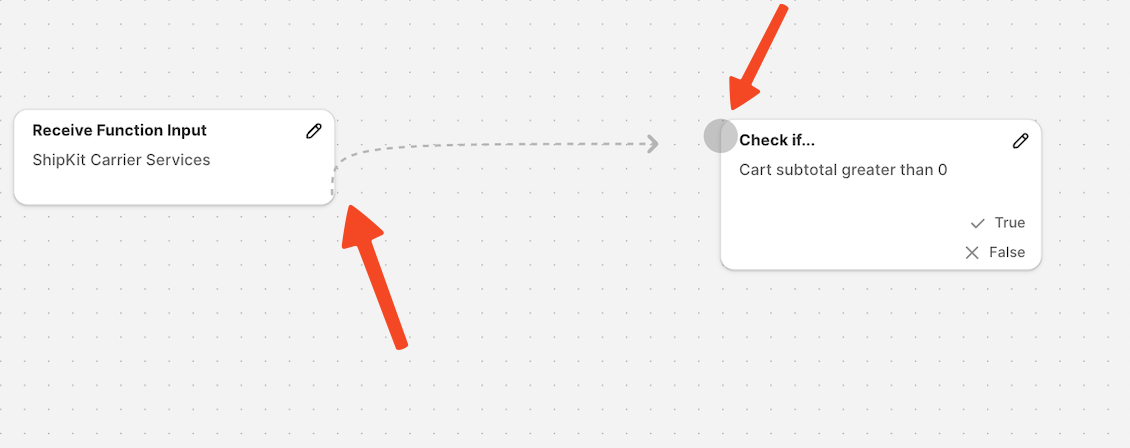 ShipKit automatically connects nodes as you create them, but you may need to reconnect two nodes that were previously disconnected, or create a custom flow structure and you need to do it manually:
