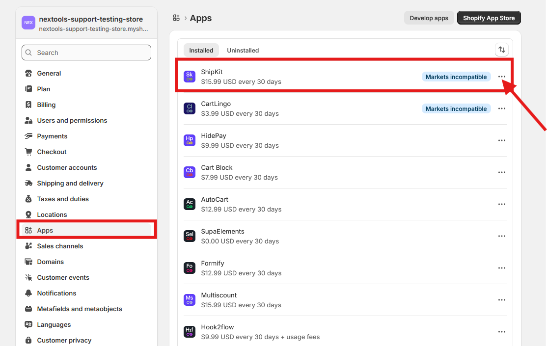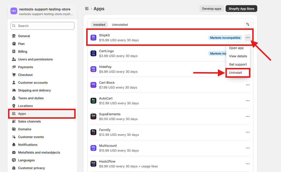 This tutorial will guide you step-by-step through the process of uninstalling the Shipkit application from your Shopify store and delete your subscription. Follow the instructions below.