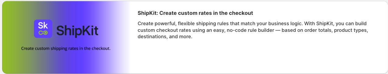 ShipKit is a powerful tool that let you create dynamic, fully customizable shipping rates inside Shopify Checkout without writing a single line of code.