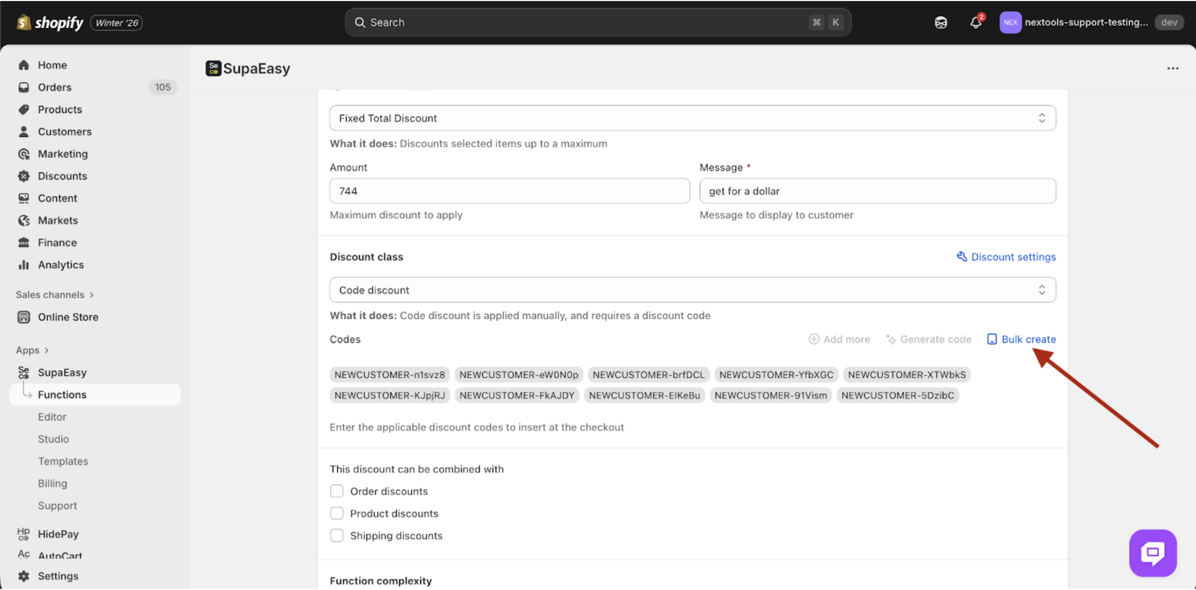 Create multiple code-based coupon discounts at once in SupaEasy. The Bulk Create tool lets you define code patterns, quantity, prefixes/suffixes, and more, then generate up to 10,000 unique codes in one go. Follow these steps to set up and run a bulk code generation job, then track and manage the results!